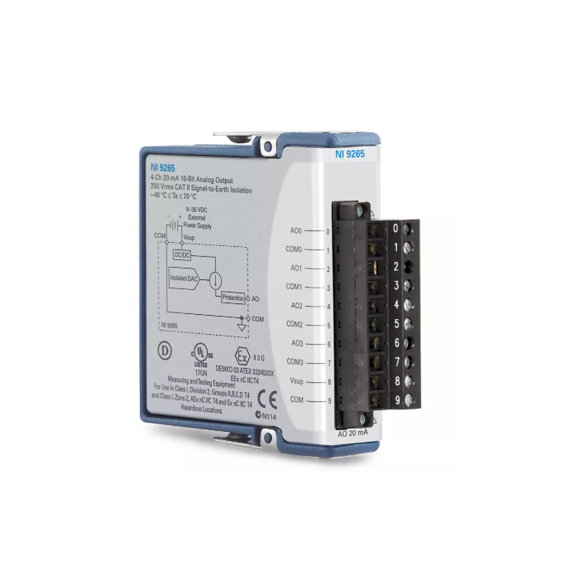 The C Series Current Output Module features up to eight channels of simultaneous analog output. You can choose between enclosed and non-enclosed modules. Additionally, the C Series Current Output Module has built-in open-loop detection. This detection generates an interrupt in software when an open loop is detected, zeros outputs to ensure safety, and avoids driving actuators at system power-on. The C Series Current Output Module requires an external power supply and includes a channel-to-earth ground double isolation barrier for safety and noise immunity.The C Series Current Output Module includes the NI-DAQmx driver and configuration utility that simplify configuration and measurements. NI-DAQmx supports NI programming environments as well as Python, ANSI C, C#.NET, and MathWorks MATLAB® software.