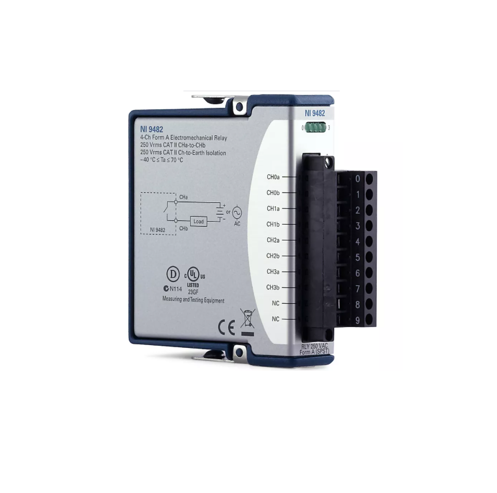 The C Series Relay Output Module enables you to switch up to eight signals at 60 V maximum DC switching voltage and up to 250 V of maximum AC switching current. For quick reference, every channel features an LED to indicate the state of that channel. The C Series Relay Output Module allows for direct connection to a wide array of industrial devices such as motors, actuators, and DC devices.The C Series Relay Output Module includes the NI-DAQmx driver and configuration utility that simplify configuration and measurements. NI-DAQmx supports NI programming environments as well as Python, ANSI C, C#.NET, and MathWorks MATLAB® software.