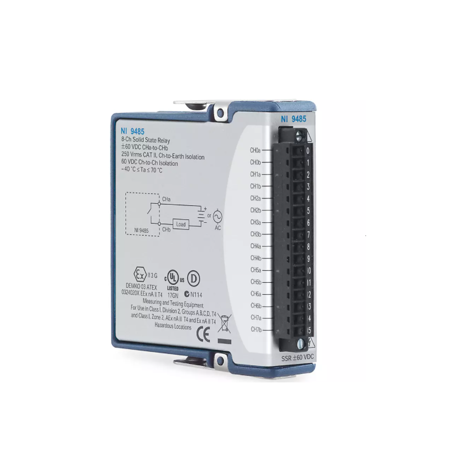 The C Series Relay Output Module enables you to switch up to eight signals at 60 V maximum DC switching voltage and up to 250 V of maximum AC switching current. For quick reference, every channel features an LED to indicate the state of that channel. The C Series Relay Output Module allows for direct connection to a wide array of industrial devices such as motors, actuators, and DC devices.The C Series Relay Output Module includes the NI-DAQmx driver and configuration utility that simplify configuration and measurements. NI-DAQmx supports NI programming environments as well as Python, ANSI C, C#.NET, and MathWorks MATLAB® software.