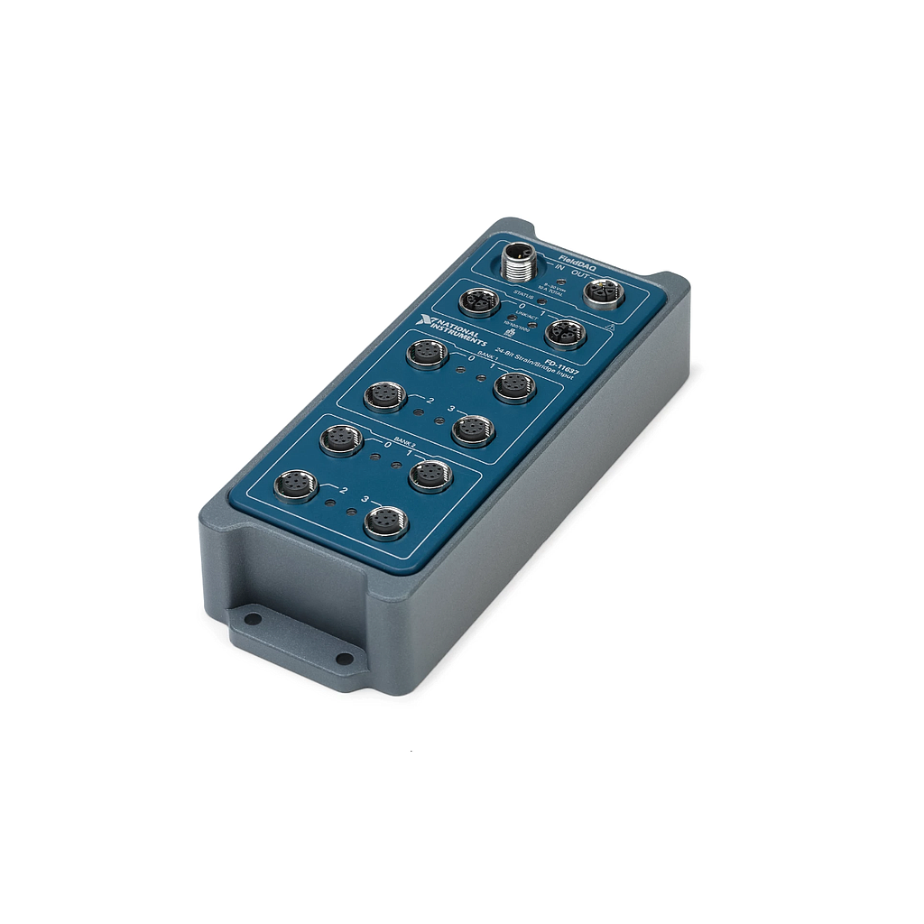 The Strain/Bridge Input Device for FieldDAQ measures up to eight channels and has built-in bridge completion and voltage excitation to support for quarter-, half-, and full-bridge sensors. The module also features anti-alias filtering, offset nulling, and shunt calibration to reduce the effect of noise and improve measurement accuracy. Additionally, the module incorporates time sensitive networking (TSN), which provides tight synchronization over a distributed network of data acquisition nodes without additional cabling or complex programming. The device features an integrated network switch and built-in power circuitry for simple daisy chaining.The Strain/Bridge Input Device for FieldDAQ Device includes the NI-DAQmx driver and configuration utility that simplify configuration and measurements. NI-DAQmx supports NI programming environments as well as Python, ANSI C, C#.NET, and MathWorks MATLAB® software.