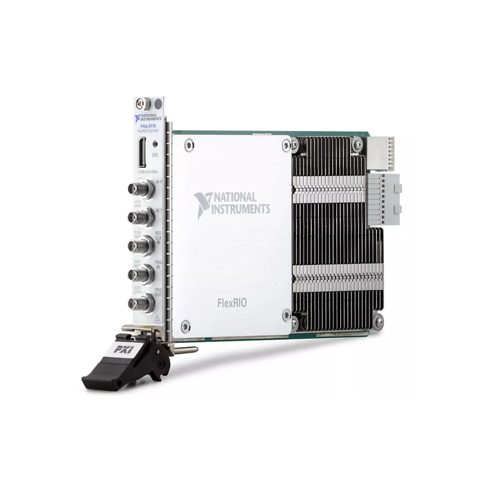 PXI FlexRIO Digitizers feature high-performance analog-to-digital converters with lightweight analog front-ends designed to maximize sample rate, bandwidth, and dynamic range. These modules use FPGAs from Xilinx alongside LabVIEW and Vivado programming options for custom algorithm implementation and real-time signal processing. For applications that require high channel counts, PXI FlexRIO Digitizers use the NI-TClk API and the timing and synchronization capabilities of PXI to achieve sub-sample synchronization between multiple modules in a chassis. These modules also feature an auxiliary I/O connector with GPIO for triggering or digital interfacing and the option for high-speed serial communication.