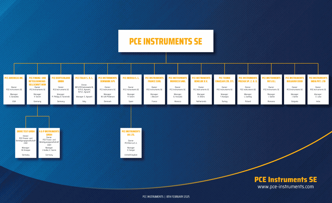 PCE Instruments is a registered trademark of PCE Holding GmbH, a corporate group comprising several specialized subsidiaries (see organization chart).