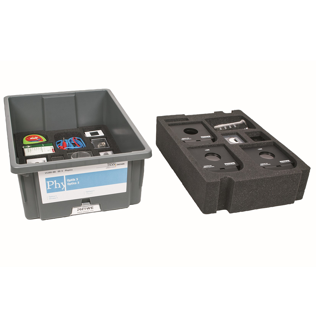 Supplementary equipment set for the sets Optics 1 (15276-88) and Optics 2 (15277-88). Together with the sets Optics 1 and 2, the optional equipment TESS Optics color mixing (13250-77) and the optional accessories for Optics 3 (13465-88), it is possible to performe 96 student experiments in total: