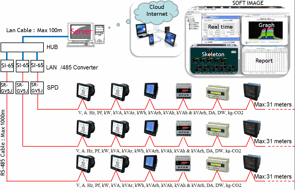 Quản lý điện năng tiêu thụ của nhà máy qua mạng nội bộ (Lan) hoặc có thể giám sát thông tin hệ thống điện nhà máy qua internet (Cloud Server).
