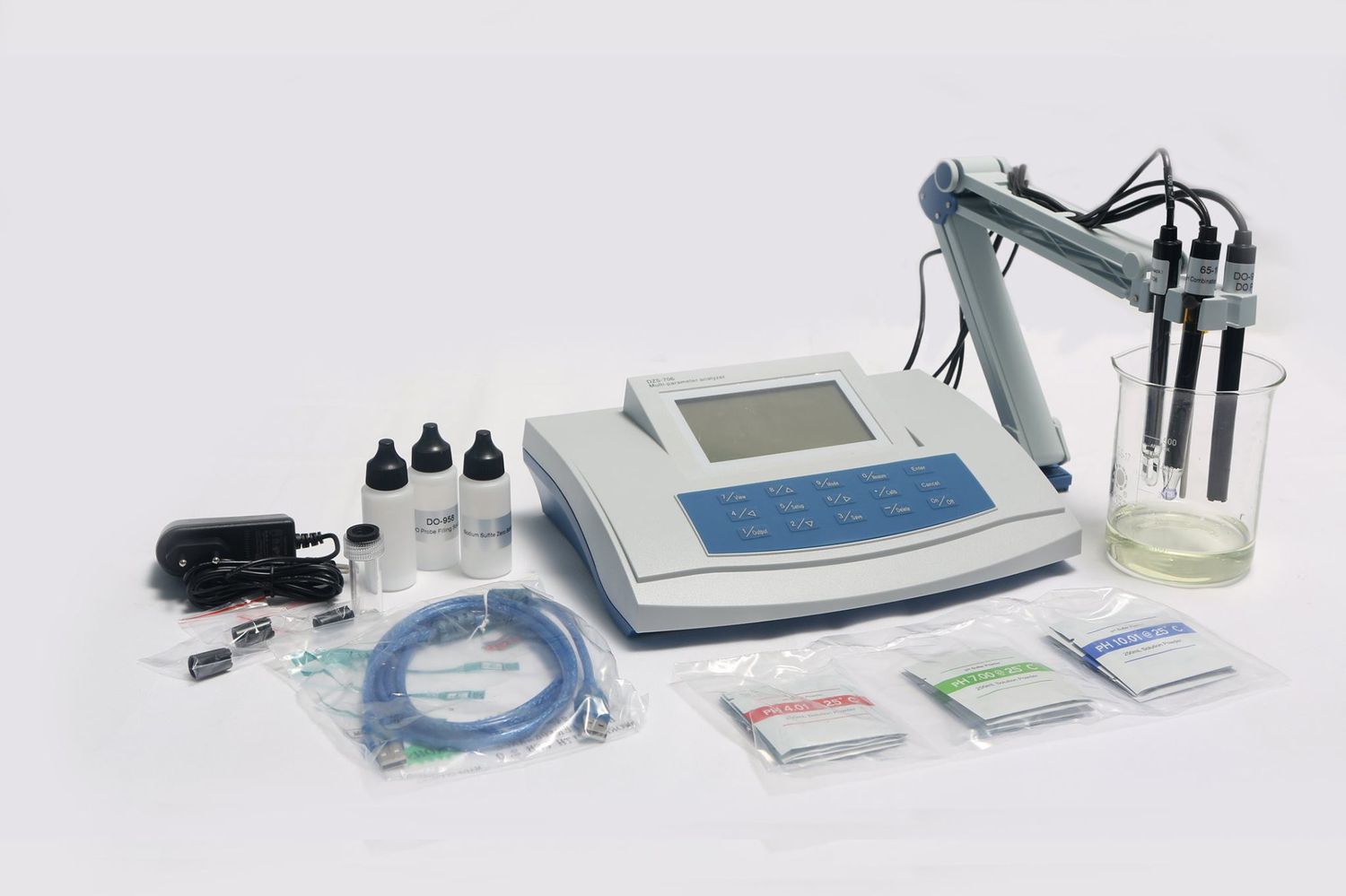 Electrodes: A wide range of electrodes for measuring pH, conductivity (EC), ion selective electrodes (ISE), dissolved oxygen (DO), temperature, ORP, reference electrodes, and titration electrodes.