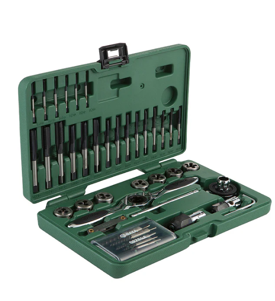 7-piece threading die set: M3 x 0.5, M4 x 0.7, M5 x 0.8, M6 x 1.0, M8 x 1.25, M10 x 1.5, M12 x 1.75