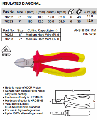 SATA 70233 INSULATED DIAGONAL PLIER 7 INCH (7 Inch, ø2.0mm, 1000V) | EMIN.CO.ID