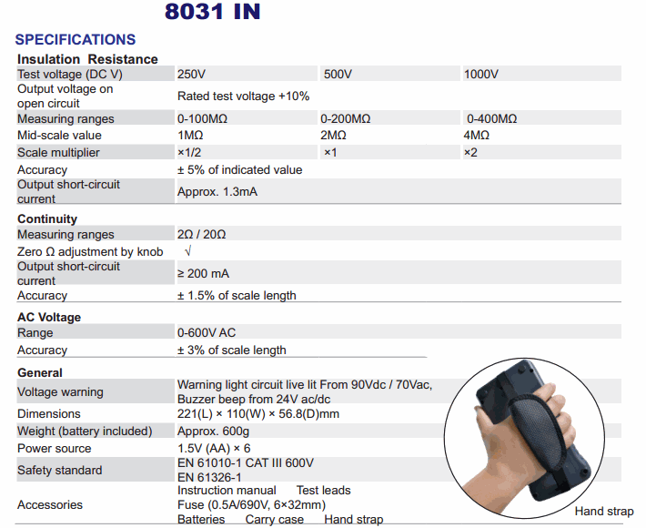 ● 1mA test current on insulation test at nominal voltage.