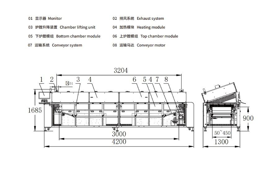 *1.Note:According to production capacity requirements, the recommended heating zone number is: 4 heating zones, 5 heating zones, 8 heating zones, 9 heating zones, 10 heating zones, 12 heating zones, which can be customized.