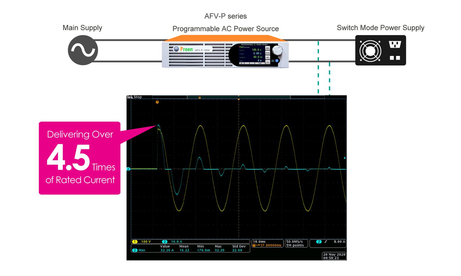 When powering up a switching power supply or a rectified load, an instantaneous high input current will be drawn to charge the capacitors. This turn-on inrush current can be as high as several times or over 10 times the steady state current. If the turn-on angle of input voltage is 90 or 270 degree, the inrush current will start at its peak value. To power up the switch mode power supply during development, verification or production stage, a programmable AC power source with a high output current becomes essential. This leads users to select an AC source with much higher output power than switching power supply’s rated power, and it increases the costs of experiments and productions. Sometimes these high power AC sources also require larger footprint.