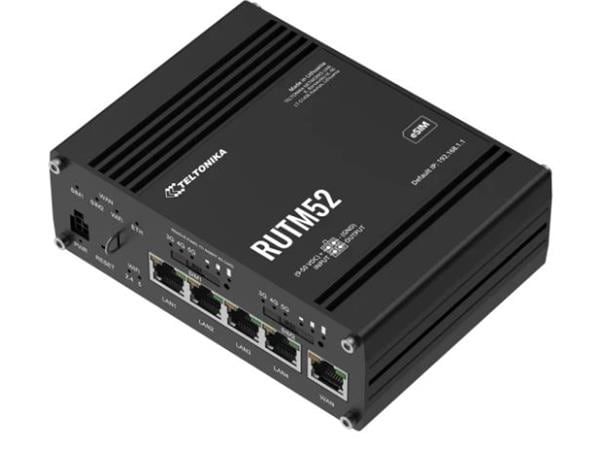 Teltonika RUTM52100000 Cellular Routers Cellular Router. Dual 5G modems, 4G CAT 20 fallback. SA, NSA. Dual SIM, eSIM. WiFi 5, GPS, 5 x Ethernet. Regions: EMEA, APAC, Brazil. PSU: EU.