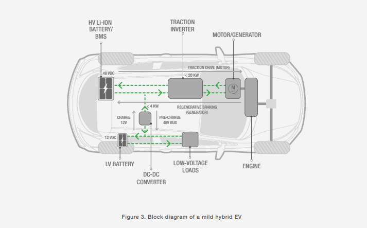 The voltage level for MHs is typically 48 V, keeping the bus structure under the 60 V safety rating for HEVs. That provides four times the potential power of the 12 V bus with the same current rating (Figure 3).