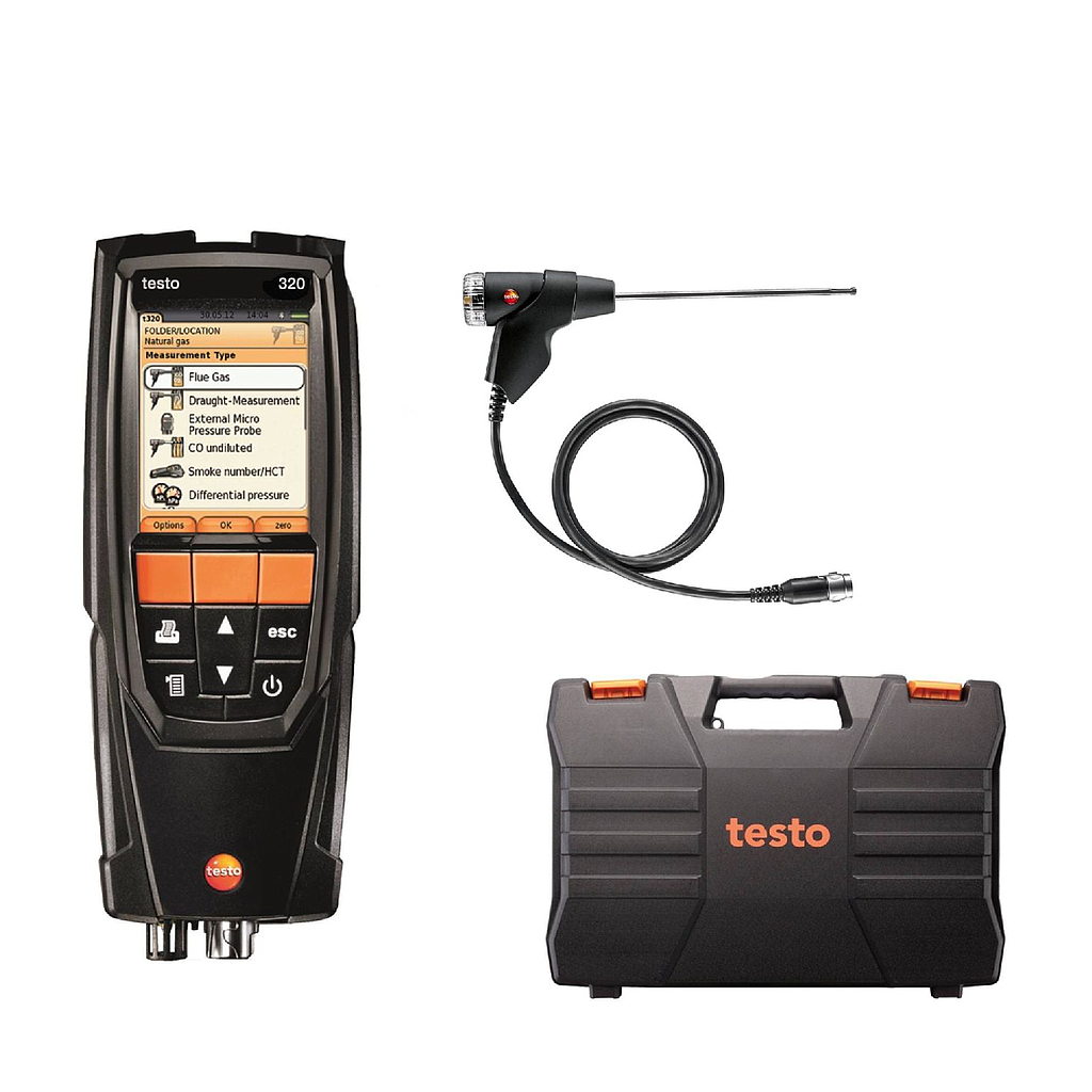 Set with flue gas analyzer testo 320 (with O2, CO measurement cell), compact 300 mm flue gas probe, Spare dirt filters, adpater, transport case and mains unit
