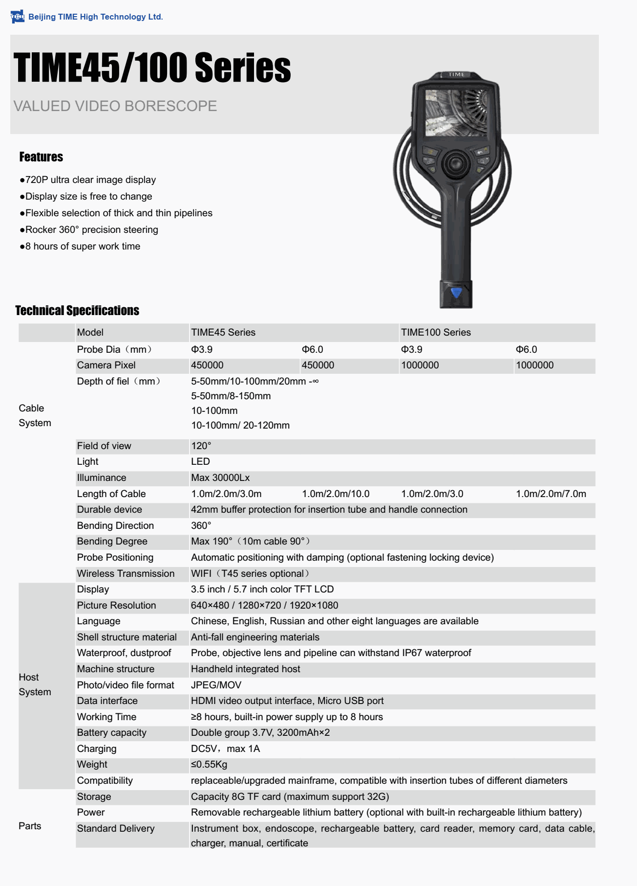 Standard Delivery: Instrument box, endoscope, rechargeable battery, card reader, memory card, data cable, charger, manual, certificate