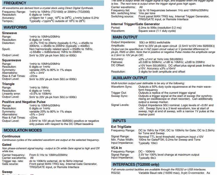 Frequency Range: 1mHz to 10MHz (TG1000) or 20MHz (TG2000)