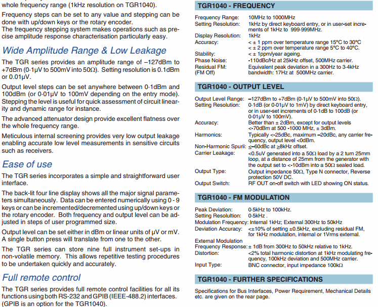 Carrier Leakage: <0.5uv generated="" into="" a="" 50="" load="" by="" a="" 2="" turn="" 25mm="" br=""> loop, at a distance of 25mm from the generator with