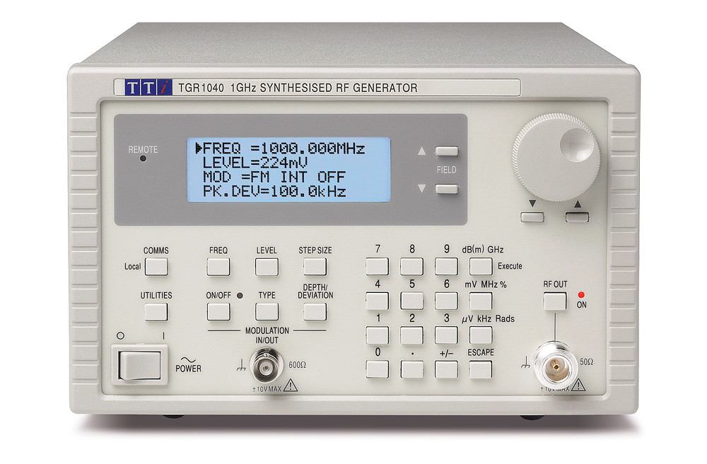 Output Switch: RF OUT on-off switch with LED showing ON status.