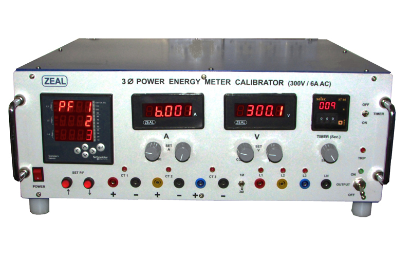 Setting Voltage, Current & Frequency by Potentiometer. Power factor by Push Button keys, Timer by thumb wheel switches.